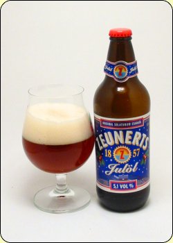 Flasktext: Stjärnorna glimmar i natten och stugan har pyntats enligt gammal tradition. I kopparpannor, öppna jäskar och med lång eftermognad och lagring tillverkas Zeunerts Julöl. Också det enligt gammal tradition.