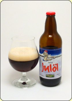 Flasktext: Jämtlands Julöl är en överjäst "ale". Det är ett fruktigt öl med en komplex maltkaraktär och en djupröd färg. Humle av högsta kvalite från hela världen ger ölet sin underbara arom. Vi önskar er alla en riktigt god jul! Serveras vid 10°-12°C.