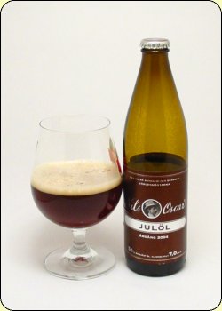 Flasktext: Nils Oscar Julöl 2004 är ett värmande överjäst öl med kraftig humlearom från amerikanska Cascade och engelska Fuggles. Som vanligt är ölet framställt av mältat korn från Tärnö säteri. Till Nils Oscar Julöl 2004 använder vi ett speciellt rostat malt, som ger rik arom och fyllig smak. Servera ölet vid 12°C till 15°C och häll upp så att det skummar ordentligt. Nils Oscar Julöl 2004 passar såväl till julbordet, som till kraftiga kötträtter eller lagrad ost. Ölet smakar utmärkt som ungt men kan också, med fördel, lagras några år. Då utvecklas smaken till ännu större mjukhet och rondör.