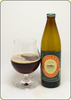 Flasktext: Oppigårds Winter Ale är mörkt och välhumlat. Våra ales och stouts bryggs i små satser av golvmältat korn och utvalda humlesorter. Omsorgen i den hantverksmässiga tillverkningen borgar för ett gott öl.