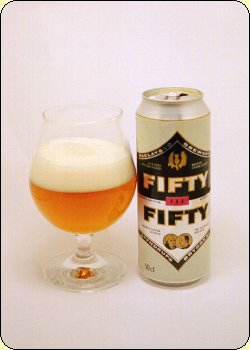 Flasktext: Fifty Fifty är inte bara två olika ölsorter som blandas, utan två kulturer, två länder och två traditioner. Det ena ölet är en överjäst mild Scottish ale. Bryggd på licens från Maclay & Co Thistle Brewery, Scotland.