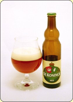 Flasktext: De Koninck is a top-fermentation beer, brewed in Belgium from the finest barley, the most selected hops and crystal-clear water.