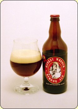 Flasktext: In an old English seaport there persists a strange legend which claims that many centuries ago when Britain was at war, a monkey was found clinging to a raft that had been washed ashore. The poor creature, chattering from cold and fright was believed to be speaking a foreign language. The monkey, thought to be a spy, was arrested and met an untimely end. In sympathy for that monkey, and in support of monkeys, this beer is called Monkey Wrench.