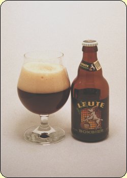 Flasktext: In de historische brouwerij van het Belgische Ertvelde wordt sinds 1927 het unieke Leute Bokbier gebrouwen. Dit extra zware robijnrode bier van hoge gisting heeft een pittig karakter. De smaak is niet te uitgesproken zoet, maar vol en mild, om uit te monden in een aangename zachtbittere afdronk. Door het plezier dat, dit bier verschafte tijdens menig gezellige najaarsavond, werd dit befaamde bokbier in de streek al gauw bekend als "Leutebok"